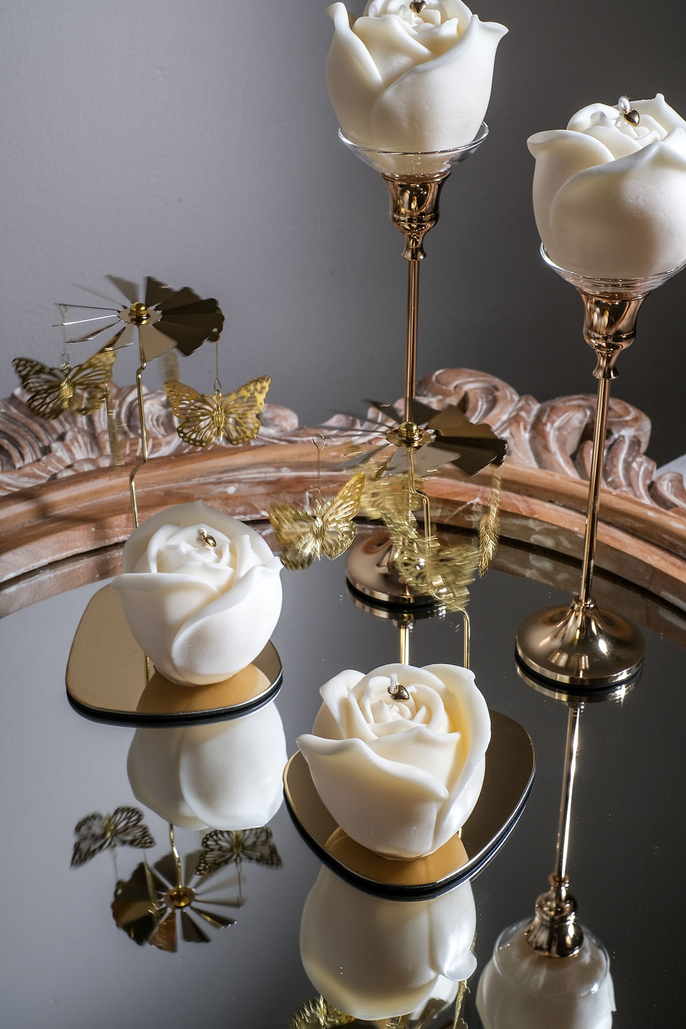 The butterfly carousel comes alive from the warmth of the candle, casting delicate dancing shadows and creating a soft, atmospheric glow. Three sculptural rose candles and two refined candle holders form a harmonious decorative ensemble.